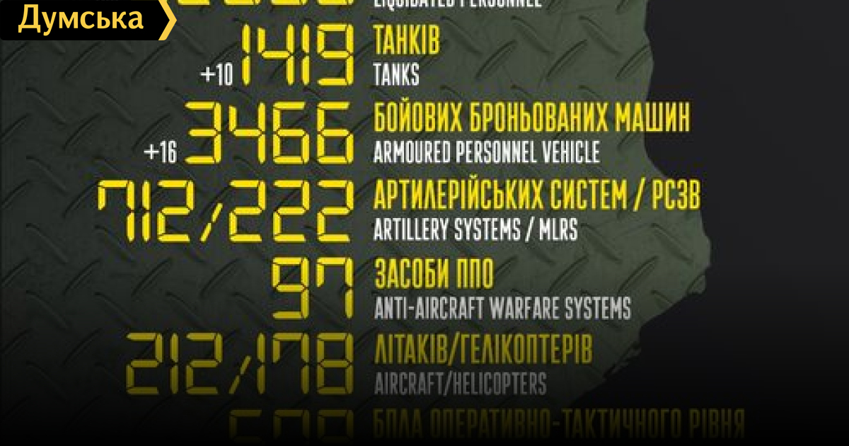 Российские оккупанты за сутки потеряли в Украине 150 человек, семь БПЛА и десять танков150 солдат, десять танков и 16 боевых бронированных машин потеряли российские нацисты за минувшие сутки в Украине. Кроме того, как сообщает Генштаб Вооруженных сил, украинские защитники уничтожили семь БПЛА оперативно-тактического уровня и десять единиц автомобильной техники. Всего с начала полномасштабного вторжения потери врага составили: личного состава — 32 050 человек; танков ‒ 1419 единиц; боевых бронированных машин ‒ 3466 единиц; артиллерийских систем — 712 единиц; РСЗО — 222 единицы; средства ПВО - 97 единиц; самолетов – 212 единиц; вертолетов – 178 единиц; БПЛА оперативно-тактического уровня – 579; крылатые ракеты — 125; корабли/катера — 13 единиц; автомобильной техники и автоцистерн — 2448 единиц; специальная техника – 54. СМЕРТЬ РОСІЙСЬКИМ ОКУПАНТАМ! Помітили помилку? Виділяйте слова з помилкою та натискайте control-enter |