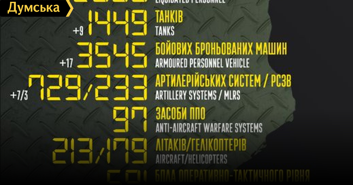 Российские оккупанты за сутки потеряли в Украине 200 человек, девять танков и семь артсистем200 солдат, девять танков и три РСЗО потеряли российские нацисты за минувшие сутки в Украине. Кроме того, как сообщает Генштаб Вооруженных сил, украинские защитники уничтожили 17 боевых бронированных машин, семь артиллерийских систем и девять единиц автомобильной техники. Всего с начала полномасштабного вторжения потери врага составили: личного состава — 32 950 человек; танков 1449 единиц; боевых бронированных машин 3545 единиц; артиллерийских систем – 729 единиц; РСЗО- 233 единицы; средства ПВО - 97 единиц; самолетов – 213 единиц; вертолетов – 179 единиц; БПЛА оперативно-тактического уровня – 591; крылатые ракеты — 129; корабли/катера — 13 единиц; автомобильной техники и автоцистерн — 2494 единицы; специальная техника – 55. СМЕРТЬ РОСІЙСЬКИМ ОКУПАНТАМ! Помітили помилку? Виділяйте слова з помилкою та натискайте control-enter |
