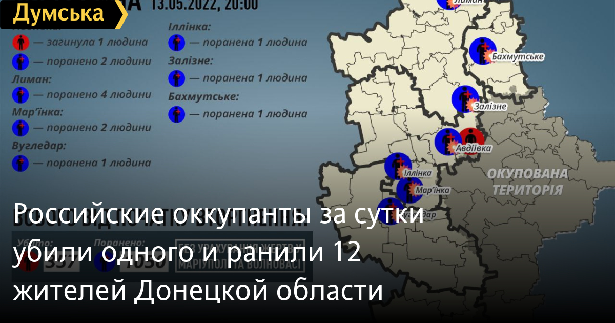 Один человек погиб и 12 получили ранения в результате вражеских обстрелов Донецкой области 13 мая. Об этом сообщил глава Донецкой ОВА Павел Кириленко. По его словам, погибший — житель Авдеевки. Точное число жертв в Мариуполе и Волновахе установить невозможно. СМЕРТЬ РОССИЙСКИМ ОККУПАНТАМ! Заметили ошибку? Выделяйте слова с ошибкой и нажимайте control-enter |