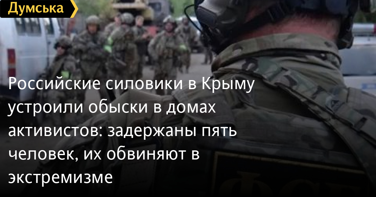 Российские силовики в Крыму устроили обыски в домах активистов: задержаны пять человек, их обвиняют в экстремизмеВ домах крымских татар в аннексированном Крыму с четырех утра во вторник, 17 августа, проходили обыски. Об этом сообщает в Фейсбук общественное движение «Крымская солидарность». По итогу было задержано пять человек. В частности, в Севастополе силовики увезли Рустема Мурасова, Рустема Таирова и Джеббара Бекирова, в Бахчисарайском районе – Заура Абдуллаева, в Симферопольском районе – имама Раифа Февзиева. Их забрали в так называемое российское управление Федеральной службы безопасности в оккупированном Крыму. Известно, что все пятеро принимали участие в организации массовых мероприятий, посещали судебные заседания с политической подоплекой, поддерживали семьи политзаключенных. Их в том числе обвиняют в экстремизме. По словам уполномоченной Верховной Рады по правам человека Людмилы Денисовой, против одного из задержанных, Рустема Мурасова уже сфабриковали уголовное производство по делу так называемой «алуштинской группы». Ночью он ездил в Ростов, где заслушал незаконно вынесенный приговор. «В очередной раз страна-оккупант прибегает к преследованию и запугиванию крымских татар. Обыски в домах граждан Украины являются грубым нарушением международных норм, в частности, статьи 5 Конвенции о защите прав человека, согласно которой гарантировано право на личную неприкосновенность, и статьи 8 Конвенции — право на уважение частной и семейной жизни», — отметила омбудсмен. Денисова также призвала международное сообщество отреагировать на неправомерные действия оккупационных властей и ужесточить давление на Россию для прекращения нарушений прав человека на территории Крыма. СМЕРТЬ РОСІЙСЬКИМ ОКУПАНТАМ! Помітили помилку? Виділяйте слова з помилкою та натискайте control-enter |