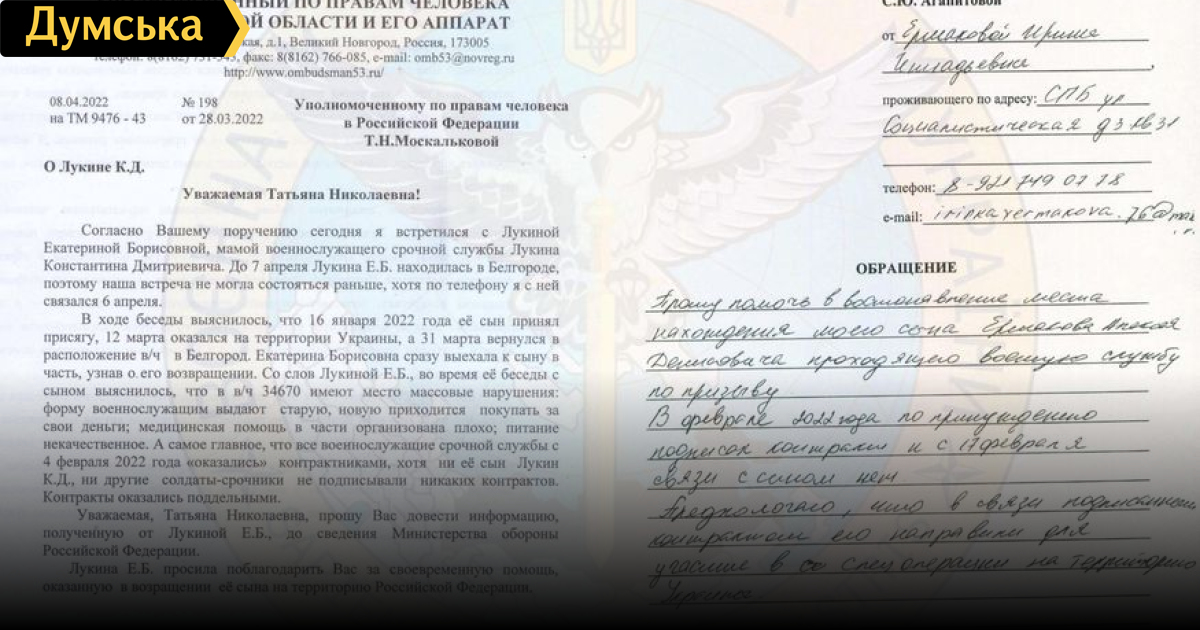 Российские срочники продолжают умирать в Украине, обращения их матерей власти рф игнорируют, — военная разведкаСрочники продолжают пополнять ряды российских оккупационных войск в Украине. Их матери обращаются с жалобами к российскому омбудсмену, но в ответ получают ложь и отписки. Обращения родителей срочников к уполномоченной по правам человека в россии Татьяне Москальковой и военным разных чинов обнародовало Главное управление разведки Министерства обороны Украины. Несмотря на уверения руководства кремля о недопущении участия срочников в так называемой «специальной операции», они продолжают пополнять ряды российских оккупационных войск, заявляют в ГУР. Именно срочники погибают первыми во время боевых действий. К неизбежной смерти или увечьям приводят их плохая обученность, устаревшее вооружение и оснащение. Кроме того, именно срочников гонят на убой в первом эшелоне войск, от чего отказываются более опытные контрактники. Матери российских срочников, понимая неотвратимость смерти их детей, обращаются с жалобами на незаконные действия командиров к уполномоченной по правам человека в россии Татьяне Москальковой, но в ответ получают очередную ложь и отписки. «Направление срочников в зону боевых действий является очередным доказательством отношения власти к своим гражданам и кадровым голодом в армии агрессора. Несмотря на скрытую мобилизацию на территории России и принудительную мобилизацию мужчин на временно неподконтрольных территориях Украины, российское командование не способно обеспечить полноценное комплектование боевых подразделений», — говорится в официальном сообщении военной разведки. Пока борьба внутри рф за жизни молодых россиян не станет массовой, они и дальше будут продолжать бесславно умирать, выполняя приказы кремлевского диктатора, добавляют в ГУР. СМЕРТЬ РОСІЙСЬКИМ ОКУПАНТАМ! Помітили помилку? Виділяйте слова з помилкою та натискайте control-enter |