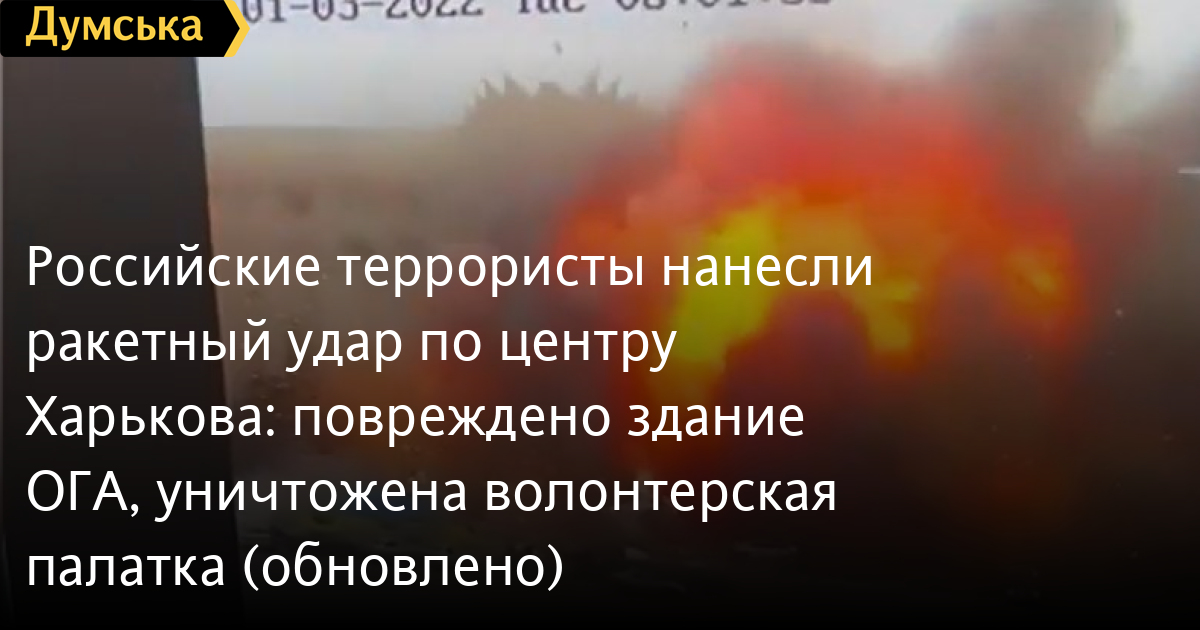 Российские террористы нанесли ракетный удар по центру Харькова: повреждено здание ОГА, уничтожена волонтерская палатка (обновлено)Враг нанес удар по центру Харькова. Террористы обстреляли площадь Свободы, где расположена Харьковская областная государственная администрация, сообщает «Суспільне». Удар произошел в 8:02:53, как видно из записи камеры видеонаблюдения. Журналисты с места событий сообщают, что оккупанты уничтожили палатку волонтеров «Все для победы». По предварительной информации координатора Бориса Редина, погибших в палатке нет. «Было два удара в здание ОГА. В палатке в то время находились около 10 человек, они побежали в укрытие, сейчас я одного мужчину найти пока не могу. Жертв в палатке нет. Сама палатка частично разрушена», — сказал Редин. ОБНОВЛЕНО В 10:15. По данным венного корреспондента Андрея Цаплиенко, в результате вражеского обстрела баллистическими ракетами площади Свободы пострадали шесть человек. Среди них один ребенок. СМЕРТЬ РОСІЙСЬКИМ ОКУПАНТАМ! Помітили помилку? Виділяйте слова з помилкою та натискайте control-enter |