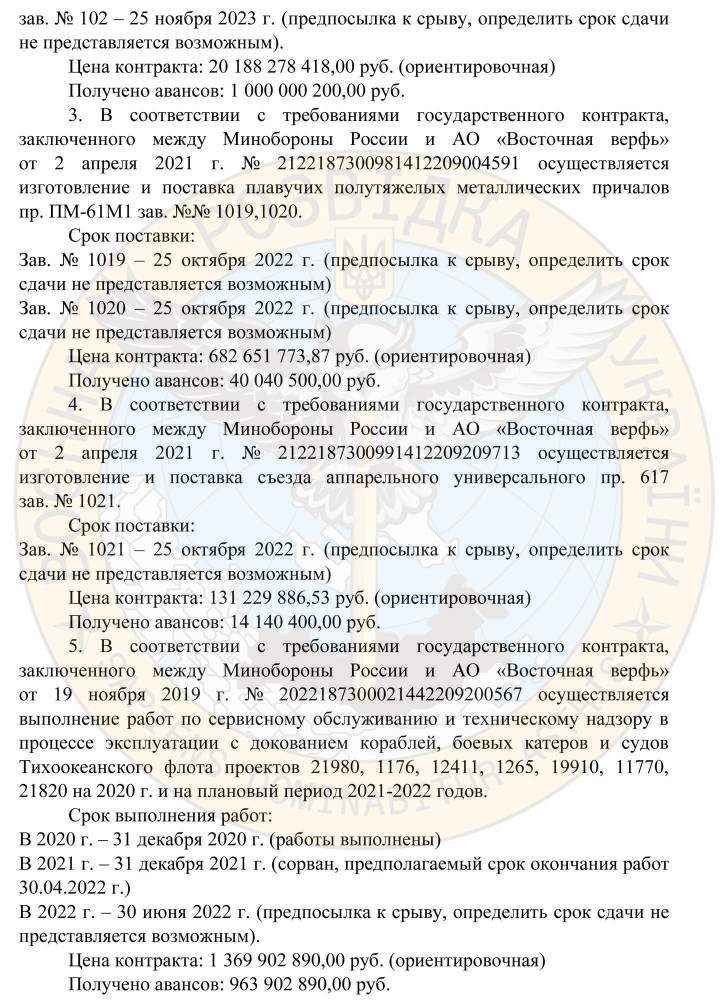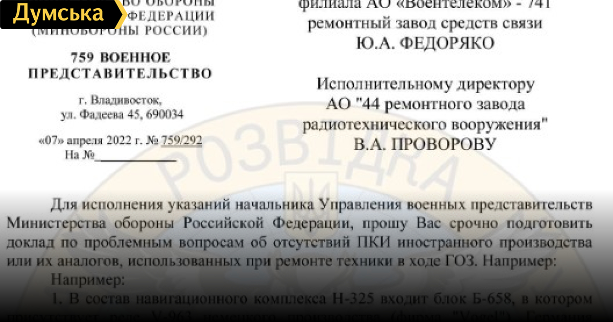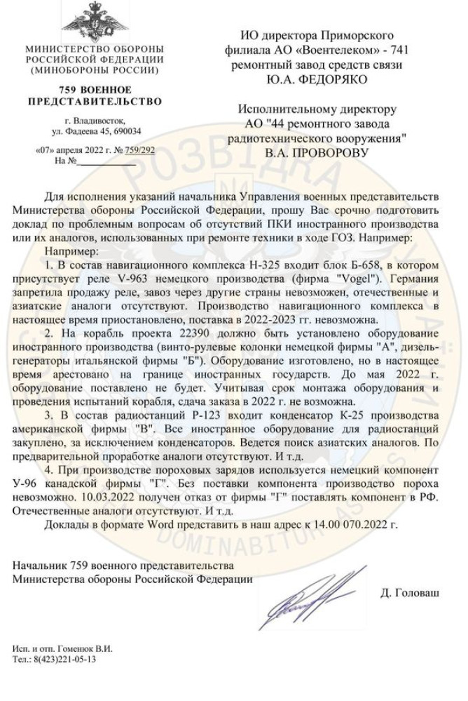 Российские верфи останавливают производство кораблей из-за нехватки иностранных комплектующих, — разведка«Аналоговнет» — российские верфи останавливают производство и обслуживание кораблей из-за тяжелого финансового положения и нехватки иностранных комплектующих. Об этом стало известно из письма военного представителя МО россии, которое обнародовало Главное управление разведки Министерства обороны Украины. В частности, АО «Восточная верфь» (Владивосток) должно выполнить государственные заказы на общую сумму 35 млрд руб. В том числе строительство и снабжение двух морских танкеров, двух малых ракетных кораблей, двух передвижных морских причалов, ремонт и сервисное обслуживание кораблей и катеров разных типов. Впрочем, из письма военного представителя МО рф становится ясно, что к началу апреля 2022 года из-за затруднительного финансового состояния все работы приостановлены. Проводится увольнение персонала, а сроки исполнения контрактов сорваны. В компании готовятся к началу процедуры банкротства. Следующее письмо военного представителя свидетельствует о тотальной нехватке иностранных компонентов для продолжения работ по строительству военных кораблей и систем для них. В список оборудования, производство которого пришлось остановить, входят, в том числе рулевые колонки, навигационные комплексы, радиостанции. Авторы письма сообщают о невозможности обнаружить российские или азиатские заменители импортных комплектующих. Также остановлено производство пороховых зарядов для морской артиллерии из-за отсутствия иностранных компонентов и отсутствия российских аналогов. Очевидно, что российский военно-промышленный комплекс остается зависимым от импортных высоких технологий. Без снабжения которых РФ не способна продолжить производство современного оружия. СМЕРТЬ РОСІЙСЬКИМ ОКУПАНТАМ! Помітили помилку? Виділяйте слова з помилкою та натискайте control-enter |