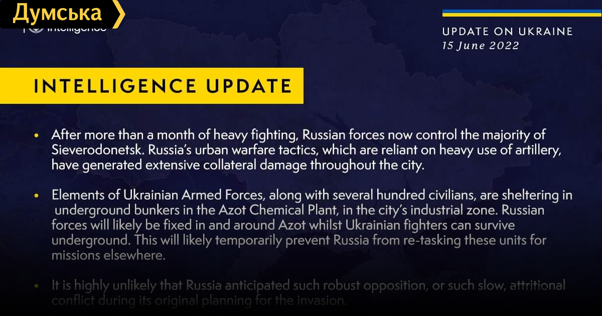 Российские нацисты могут заблокировать завод «Азот» в Северодонецке: там находятся несколько сотен человекОккупанты могут заблокировать людей, которые прячутся на территории химического завода «Азот» в частично захваченном Северодонецке. Такой прогноз дает разведка Министерства обороны Великобритании. Аналитики британской разведки сообщают, что сейчас в подземных бункерах предприятия в промзоне города укрываются подразделения Вооруженных сил Украины и несколько сотен мирных жителей. «Российские силы, вероятно, закрепятся на «Азоте» и вокруг него, в то время как украинские военные смогут выжить под землей. Это, вероятно, временно помешает россии перебросить эти подразделения для выполнения других миссий», – считают в Министерстве. В сводке сообщается, что очень маловероятно, что москва ожидала такого сильного сопротивления или такого затяжного конфликта на истощение при первоначальном планировании вторжения в Украину. СМЕРТЬ РОСІЙСЬКИМ ОКУПАНТАМ! Помітили помилку? Виділяйте слова з помилкою та натискайте control-enter |