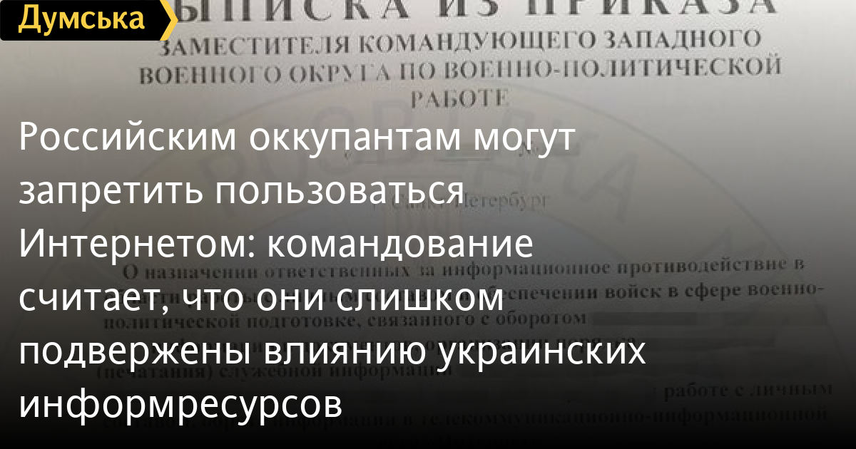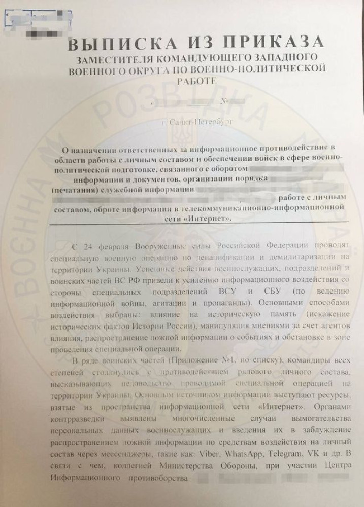 Российское командование жалуется, что украинские военные и спецслужбы слишком сильно влияют на оккупантов. Речь идет об информационной войне, агитации и пропаганде. Об этом говорится в «Выписке по приказу заместителя командующего западным военным округом по военно-политической работе», которую разослали в военные части.