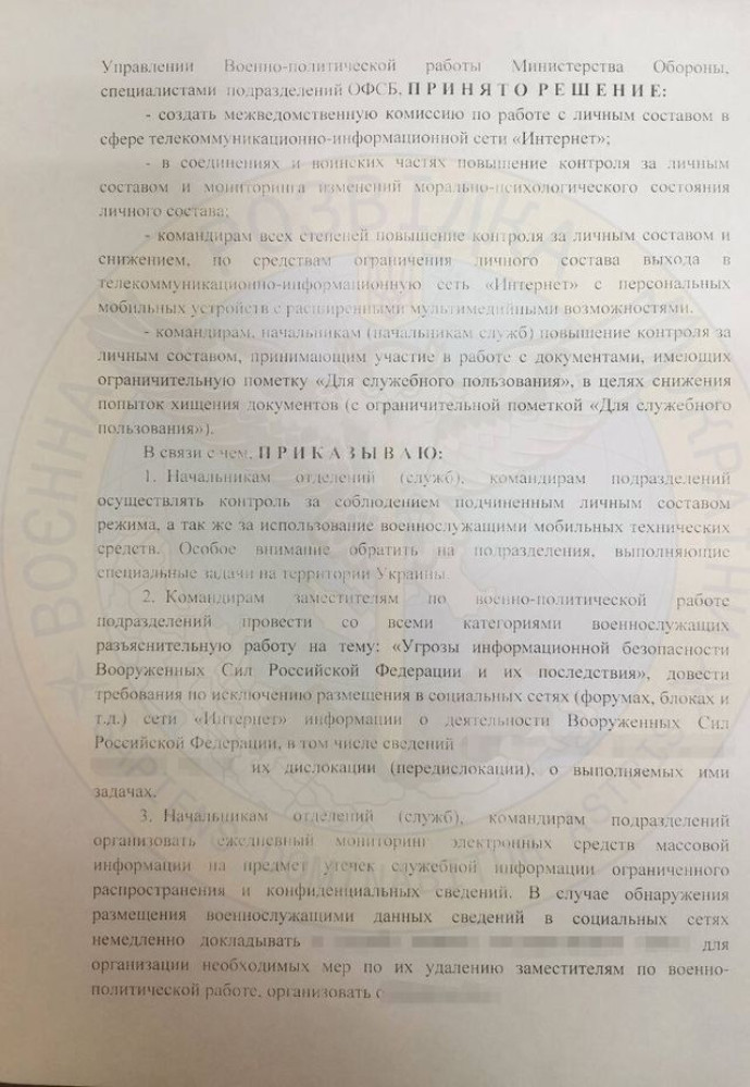 «Командиры всех степеней столкнулись с противодействием личного состава», который выражает недовольство войной в Украине, говорится в документе. А виноваты во всем, мол, Интернет и популярные мессенджеры.