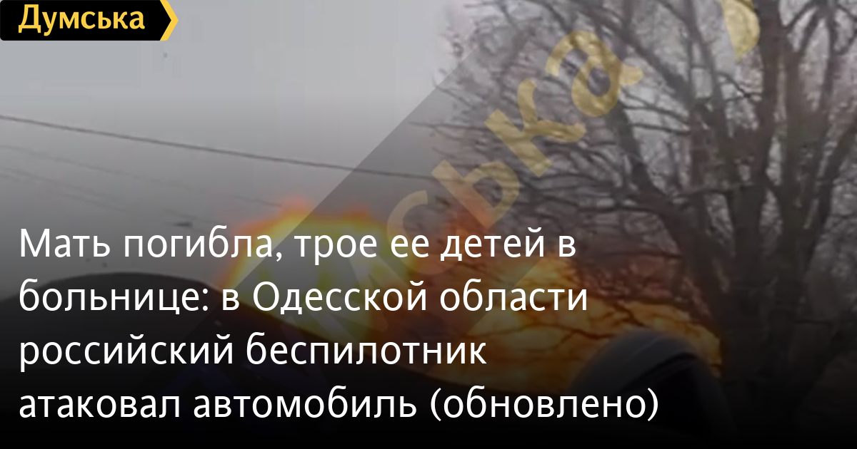 Мати загинула, троє її дітей у лікарні: на Одещині російський безпілотник атакував автомобіль (оновлено)Жінка загинула, а її троє дітей зазнали поранень унаслідок російського удару по мосту на Одещині. Як повідомили в Одеській обласній військовій адміністрації, ворожий дрон атакував автомобіль, у якому їхали люди. У машині перебувала мати з трьома дітьми. Від отриманих важких травм жінка померла в кареті швидкої допомоги. Її трьох дітей доправили в лікарню з тілесними ушкодженнями та гострою реакцією на стрес. Їм надають необхідну медичну допомогу. Обласна влада закликала водіїв утриматися від руху в районі мосту через Дністровський лиман біля села Маяки. За даними адміністрації, ця ділянка вже тричі зазнавала ворожих атак. Нагадаємо, наразі ділянка автодороги М-15 Одеса – Рені по території села Маяки втимчасово перекрито для руху транспорту. ОНОВЛЕНО О 19:22 Як повідомили в прокуратурі, загиблій було 43 роки. Травми отримали її діти: 20-річна донька, 16-річний хлопець та маленька 4-річна дівчинка. Всіх постраждалих доставили до лікарні. Також пошкоджено об’єкт критичної інфраструктури. Розпочато досудове розслідування за фактами вчинення воєнних злочинів, що спричинили загибель людей (ч. 2 ст. 438 КК України). СМЕРТЬ РОСІЙСЬКИМ ОКУПАНТАМ! Помітили помилку? Виділяйте слова з помилкою та натискайте control-enter |