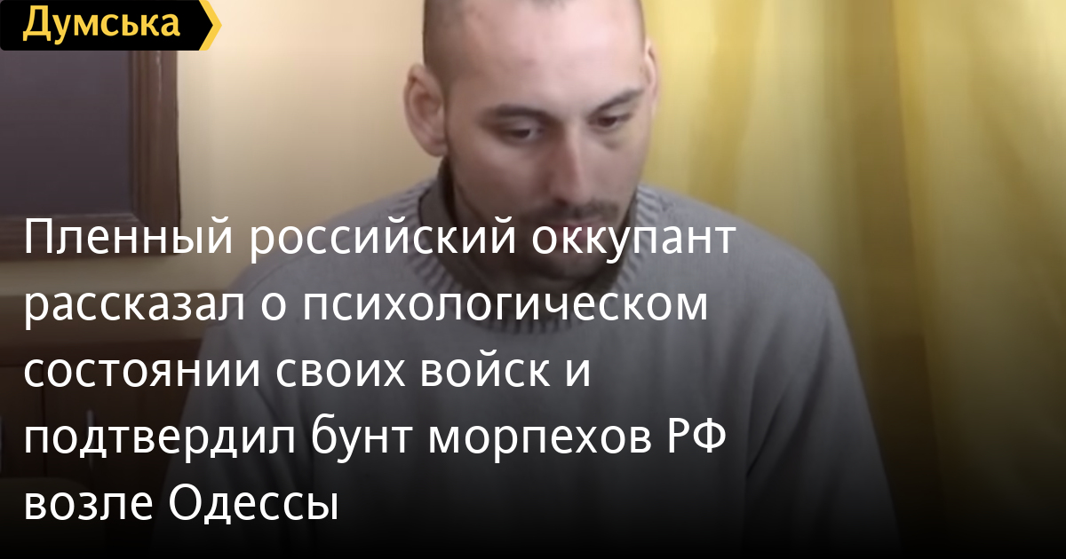 Пленный российский оккупант рассказал о психологическом состоянии своих войск и подтвердил бунт морпехов РФ возле ОдессыРоссийский оккупант — сапер одного из подразделений, сдавшийся в плен под Николаевом, рассказал о психологическом состоянии группировки РФ, вторгнувшейся в Украину. По его словам, командиры говорили солдатам, что они едут в Украину «для миротворческой операции», а они попали на войну. Также пленный сообщил, что отказываться от участия в агрессии, однако повернуть назад было запрещено под страхом смерти. Сапер армии агрессора подтвердил информацию «Думской» о бунте морпехов на российском большом десантном корабле, когда 600 десантников планировали высадить на побережье под Одессой, но они отказались выполнять преступный приказ. СМЕРТЬ РОСІЙСЬКИМ ОКУПАНТАМ! Помітили помилку? Виділяйте слова з помилкою та натискайте control-enter |