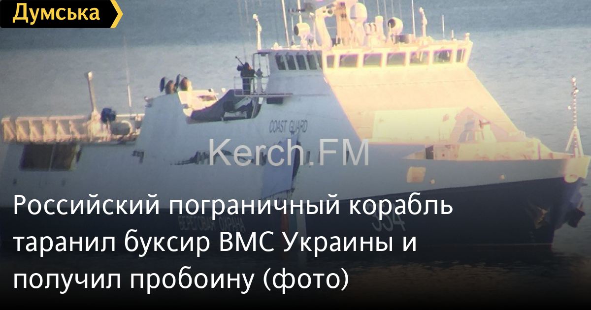 ОБНОВЛЕНО В 13:07. Кстати, таранивший украинский буксир пограничный корабль ФСБ РФ «Дон» (фактически это большой океанский буксир с оружием) сам получил метровую пробоину и сейчас борется за живучесть. Инцидент произошел в 8:26.