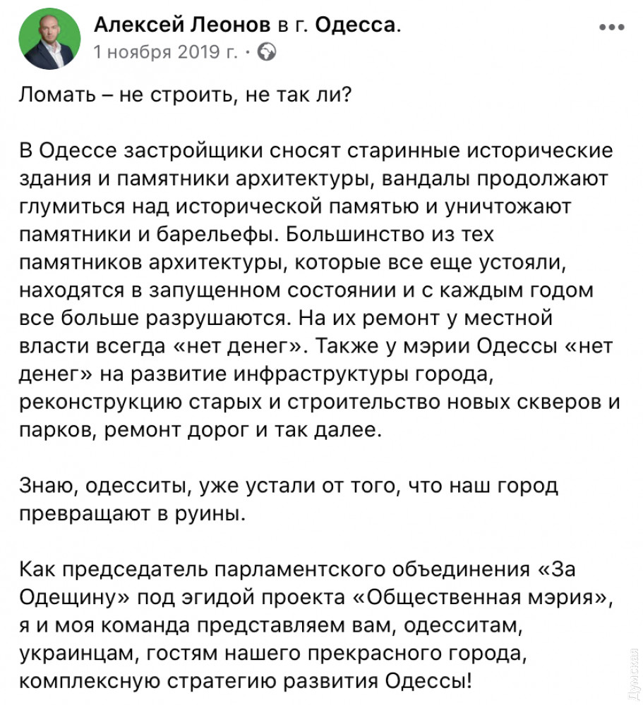 Отметим, что в ноябре прошлого года нардеп заявил о своем намерении «завершить реконструкцию фасадов в историческом центре Одессы». Эту задачу Леонов себе поставил в шестом пункте опубликованной программы.