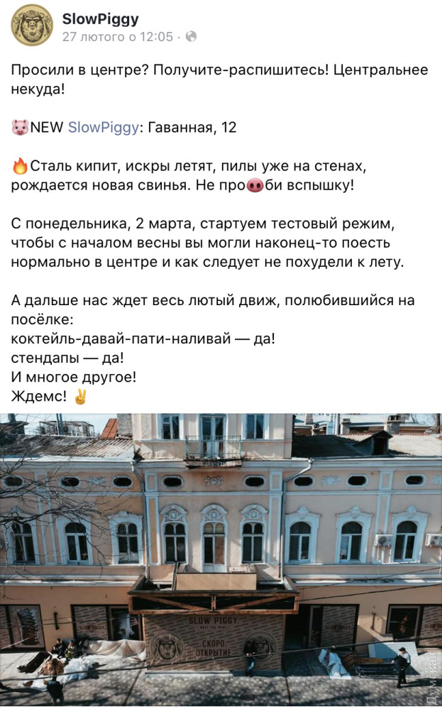 «Просили в центре? Получите-распишитесь! Центральнее некуда! — сообщают на странице заведения в «Фейсбуке». — Сталь кипит, искры летят, пилы уже на стенах, рождается новая свинья. Не про би вспышку!».