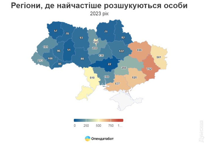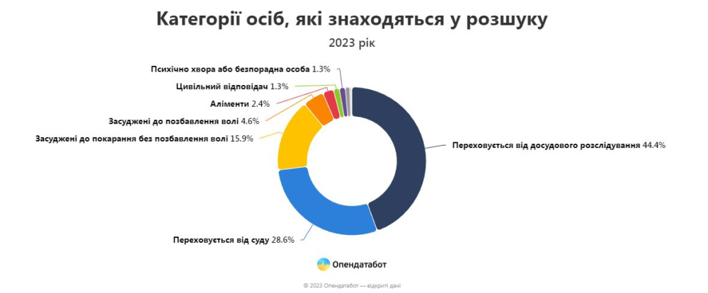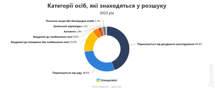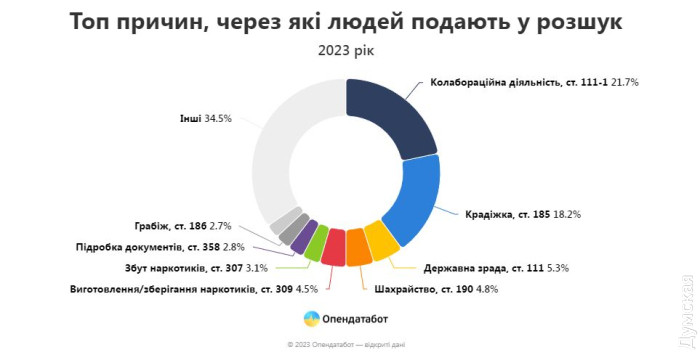 Шукають за колабораціонізм, крадіжки та шахрайство: Одещина — на другому місці серед неприфронтових областей за кількістю людей у розшукуМайже 7,5 тис. осіб було подано в розшук минулого року за даними Міністерства внутрішніх справ. Найчастіше через колабораціонізм, крадіжки та шахрайство, пише «Опендатабот». Більшість розшукуваних віком від 24 до 45 років. 7422 — це найбільша кількість за останні п'ять років і на 40% більше, ніж 2021 року. Напередодні повномасштабної в розшук подали 5269 осіб за рік. Майже половина (44%) людей із реєстру були подані в розшук у прифронтових регіонах. Очолює антитоп Донецька — 752 особи (10,1%), продовжують Харківська — 696 (9,4%), Херсонська — 637 (8,6%), Запорізька — 620 (8,4%) і Луганська області — 561 (7,6%). В Одеській області розшукують 510 осіб. Це другий показник серед не прифронтових регіонів. Лідирує — Київ. Найчастіше у 2023 році в розшук потрапляли за колабораціонізм — 21,7%. У топі причин, через які людину можуть внести в розшук, також крадіжки — 18,2%, державна зрада — 5,3% і шахрайство — 4,8%. Майже половина людей у розшуку переховуються від органів досудового розслідування — 3 299 осіб або 44%. На другому місці ті, хто переховується від суду — 2 126 осіб. Трійку замикають люди, засуджені до покарання без позбавлення волі — 1183 особи. Дозвіл на затримання винесено щодо 18% людей у розшуку, а ще 15% мають бути під вартою. 79% людей у розшуку — це чоловіки, жінки становлять 21% від загальної кількості у 2023 році. Більшість людей у розшуку у 2023 році від 25 до 45 років. Найстаршому розшукуваному 87 років, а наймолодшому — 6 років. Загалом на кінець січня 2024 року в розшуку перебуває 55 992 особи. СМЕРТЬ РОСІЙСЬКИМ ОКУПАНТАМ! Помітили помилку? Виділяйте слова з помилкою та натискайте control-enter |