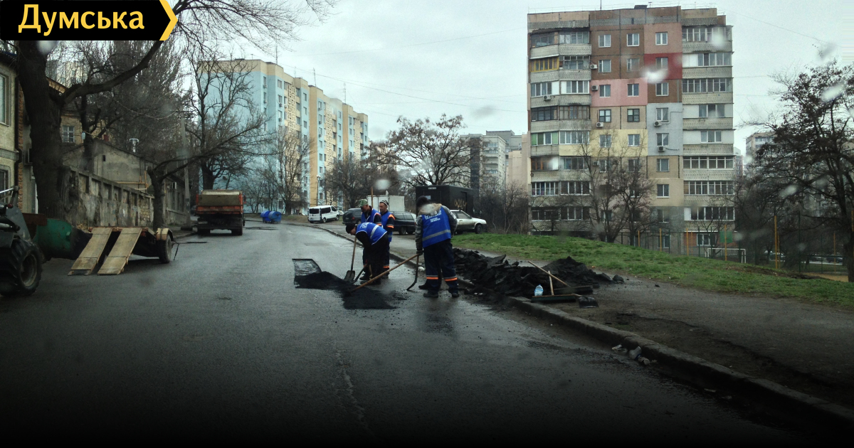 Работники дорожных служб в Одессе латают ямы на дорогах во время дождя, сообщает организация «Общественный контроль».