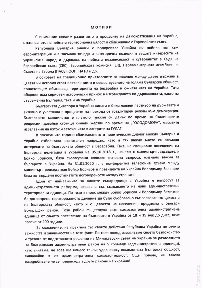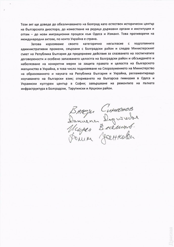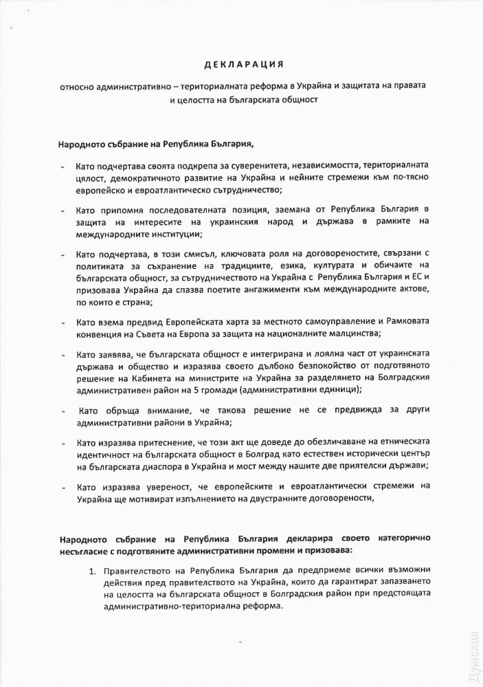 Согласно тексту декларации, болгарский парламент «решительно не согласен» с запланированными административными изменениями в Украине и призывает болгарское правительство «принять все возможные меры перед правительством Украины, чтобы обеспечить сохранение целостности болгарской общины в Болградском районе» Одесской области.