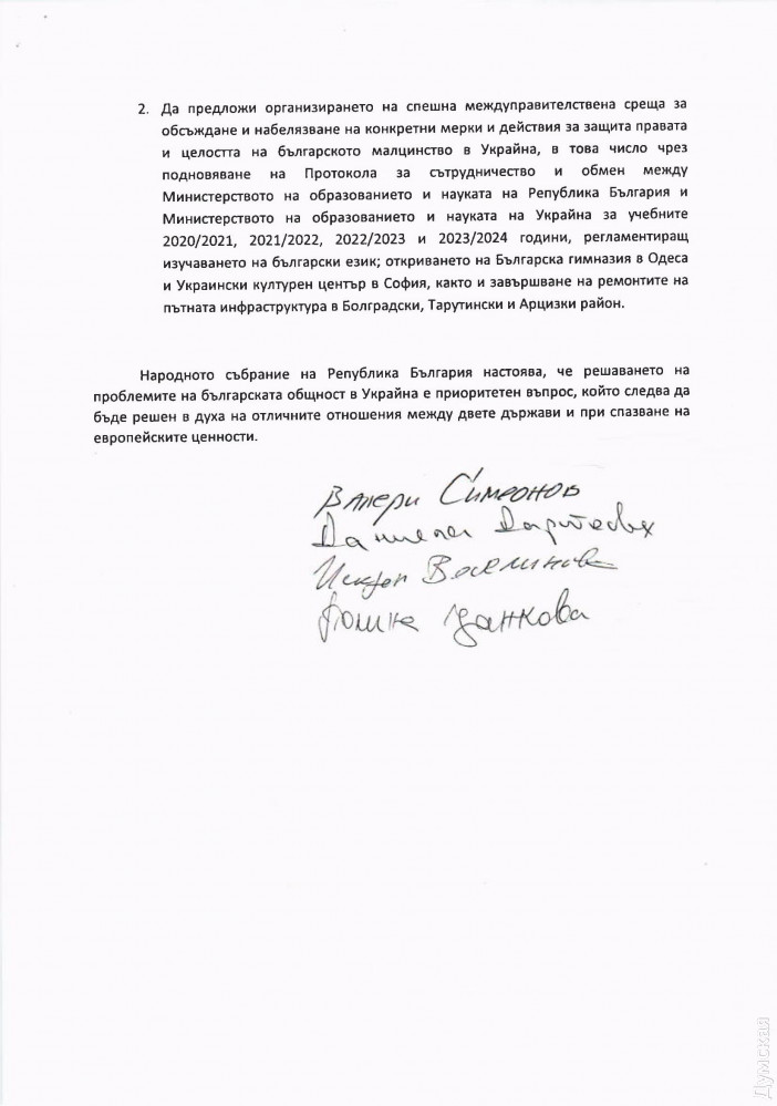 Национальное собрание также призвало свое правительство организовать срочное межправительственное совещание для обсуждения и определения конкретных мер и действий по защите «прав и целостности» болгарского меньшинства в Украине, в том числе путем обновления Протокола о сотрудничестве и обмене между министерствами образования и науки обеих стран на учебные годы 2020/2021, 2021/2022, 2022/2023 и 2023/2024. Подписав этот документ, украинские чиновники взялись открыть болгарскую школу в Одессе и завершить ремонт дорог в Болградском, Тарутинском и Арцизском районах Одесской области, а болгарские — создать Украинский культурный центр в Софии.