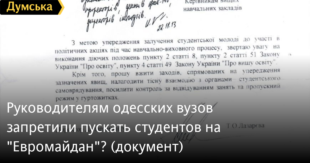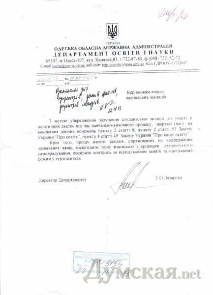 Департамент образования Одесской облгосадминистрации издал распоряжение, согласно которому руководство вузов, а также общежитий должно более пристально следить за студентами, чтобы не допустить появления последних на акциях протеста.
