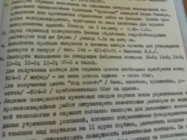 Перейдем к вопросу о ремонте наших фасадов и разберемся, почему здание окрашивается именно таким цветом, а не другим. Когда встал вопрос о ремонте портика со стороны Пале-Рояля и фонтана – нами были подняты документы, оставленные проектантами (Институт «Укрпроектреставрация» (директор – Антонюк, исполнитель – Иваненко), в том числе документ «Паспорт окраски фасадов портиков театра».