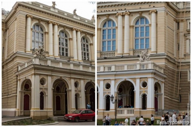 Как говорится в обнародованном пресс-службой театра опровержении, на фотографии сайта culturemeter.od.ua, которая иллюстрирует публикацию, изображены два разных портика: слева – тот, который выходит на Пале-Рояль, справа – выходящий на фонтан. Далее приводим текст опровержения: