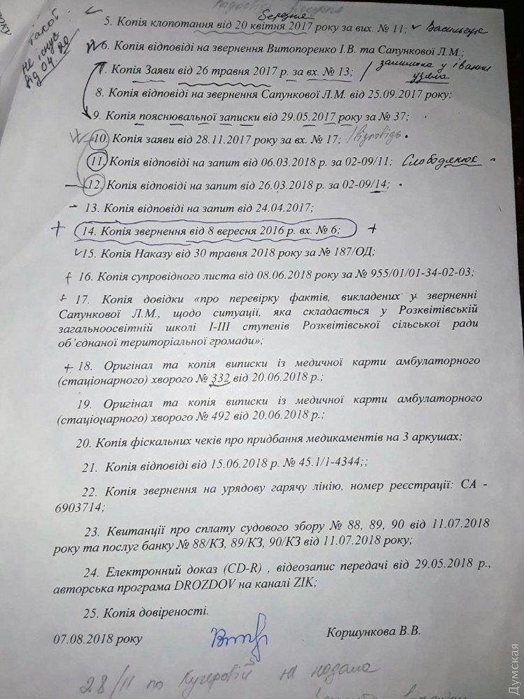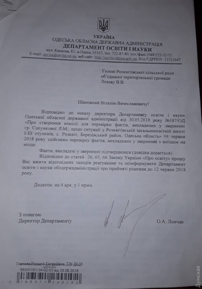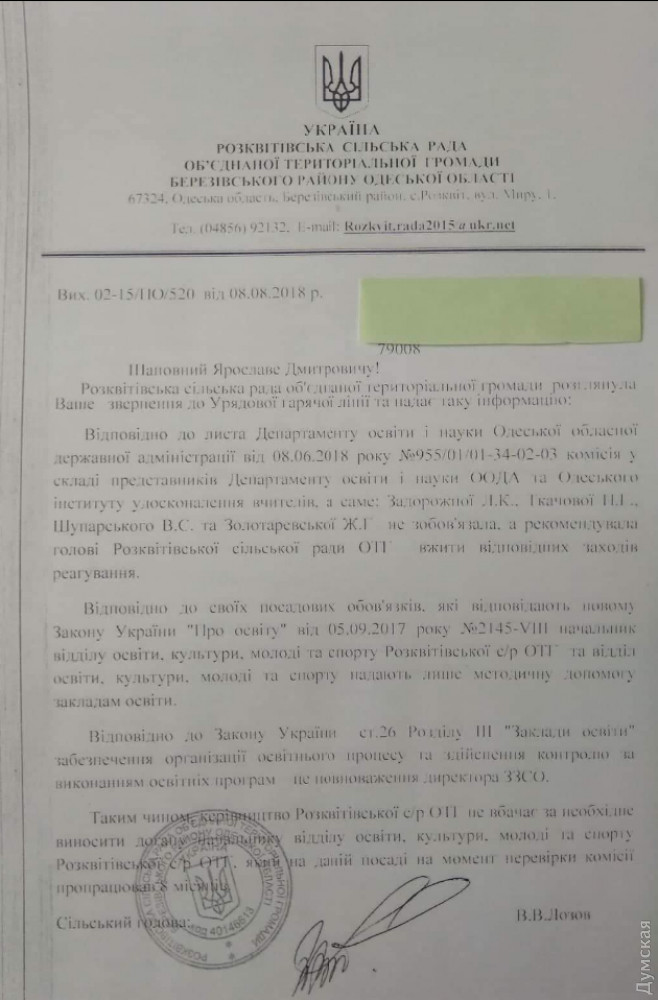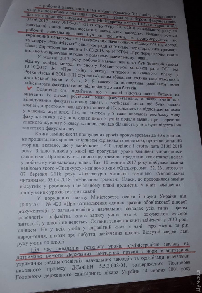 Она отметила, что в июле комиссия департамента образования и науки Одесской облгосадминистрации проверила школу, выявила ряд нарушений и рекомендовала рассмотреть вопрос о соответствии Валентины Коршунковой занимаемой должности, а некоторых учителей школы и начальника отдела образования Розквисткого сельсовета Сергея Кучерова — привлечь к административной ответственности. Однако все эти рекомендации были проигнорированы. Кроме того, несмотря на выводы комиссии, глава Розквитского сельсовета, «оппоблоковец» Виталий Лозов не увидел необходимости объявить начальнику отдела образования выговор.