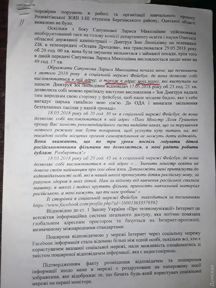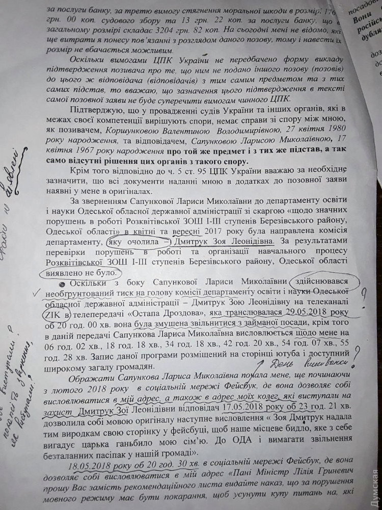 В свою очередь Лариса Сапункова уверена, что за исками директора школы и учителя стоит чиновник из департамента образования и науки ОГА Зоя Дмитрук, которая до скандала проводила проверки розквитской школы и не находила никаких нарушений.