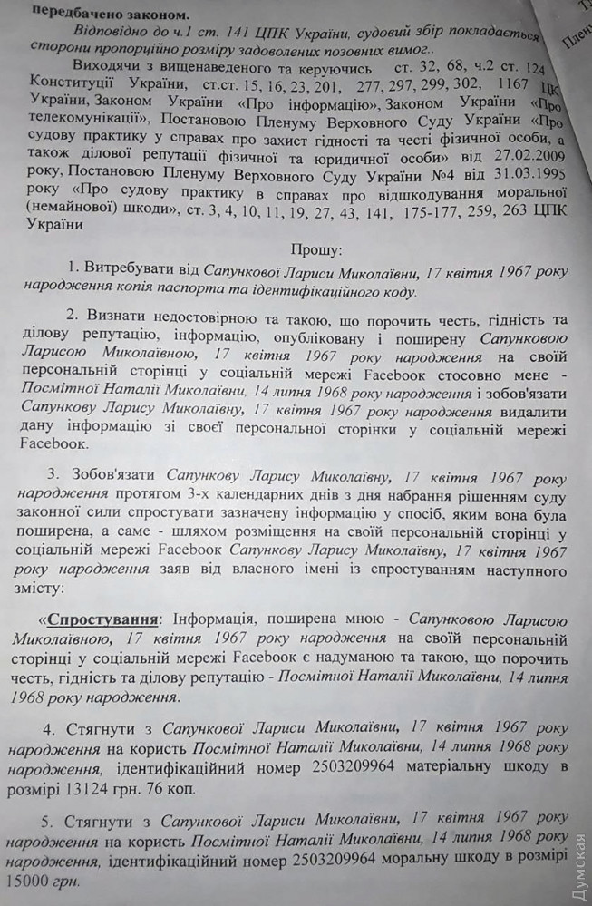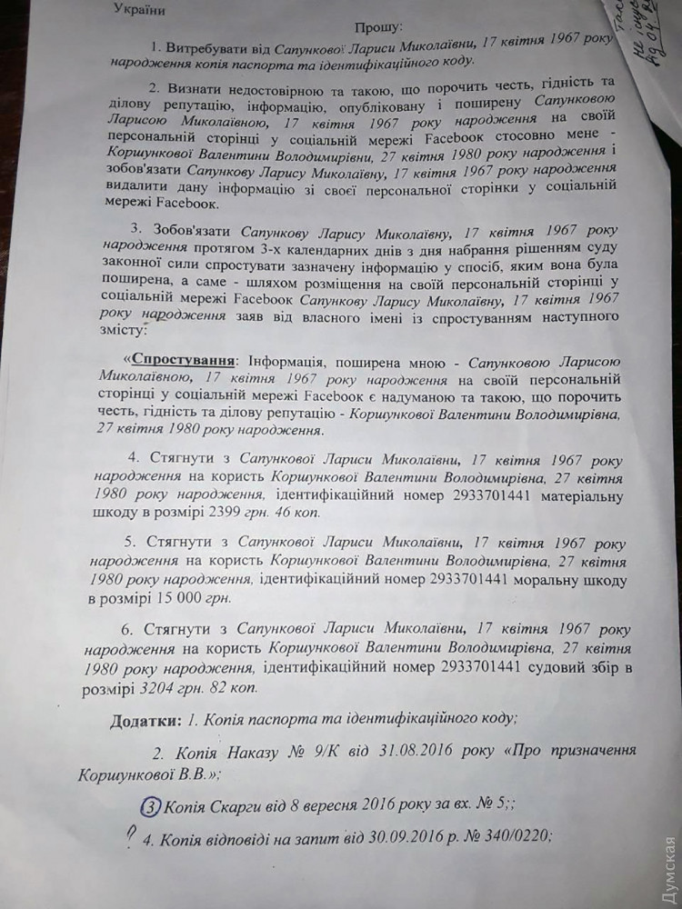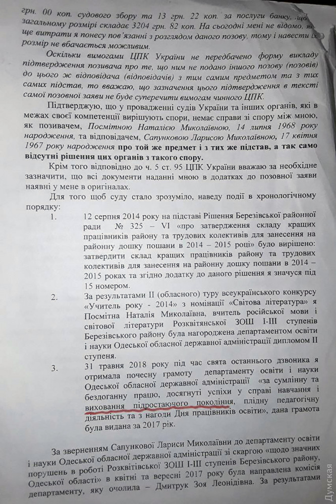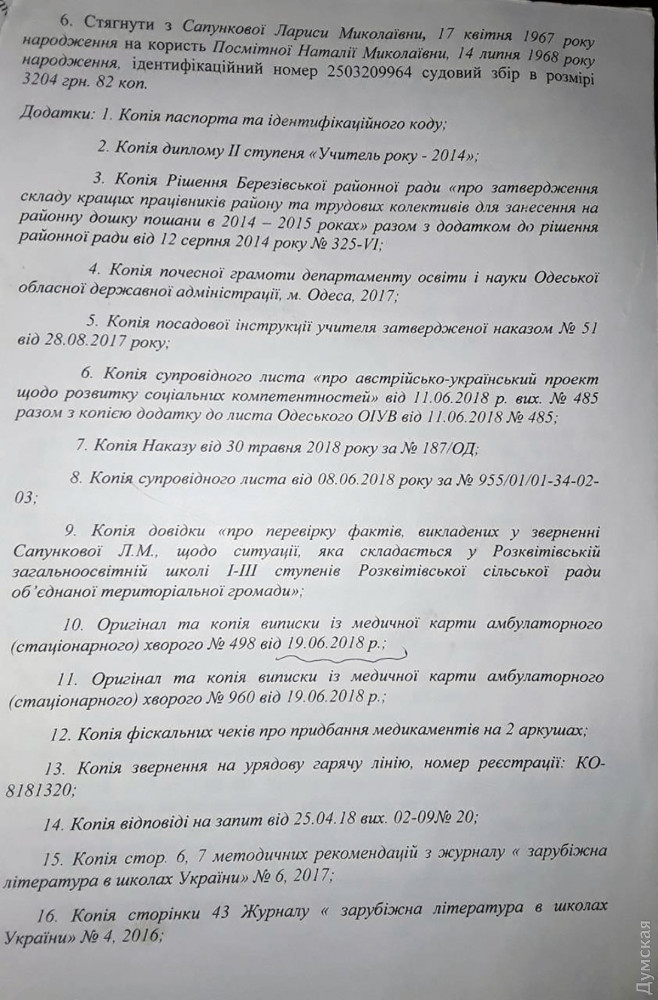 После этого оставшаяся на посту директор школы и преподаватель Наталья Посмитная (она тоже фигурирует в отчете комиссии) подали на Сапункову в суд, мол, она их оклеветала в соцсетях. Причиненный мамой учеников ущерб педагоги оценили в общей сложности в 52 тысячи гривен.