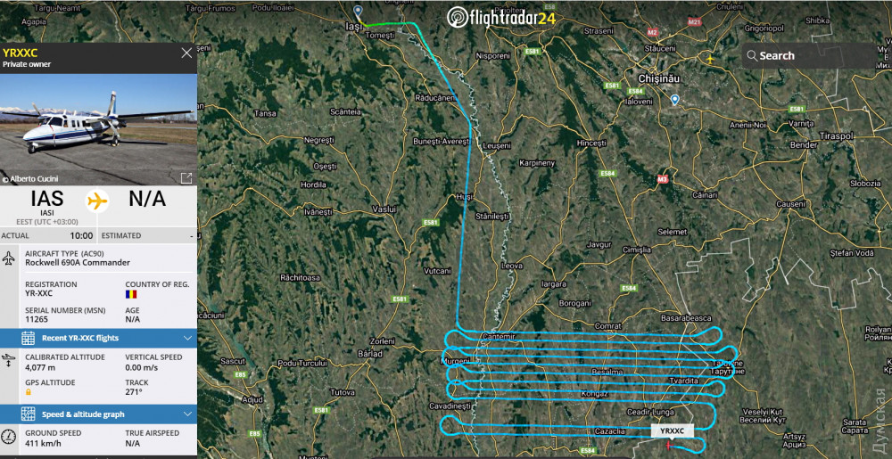 Румынский самолет Rockwell 690A Commander с регистрацией YR-XXC в данный момент летает над территорией Молдовы, заходя в воздушное пространство приграничных районов соседней Румынии и Одесской области.