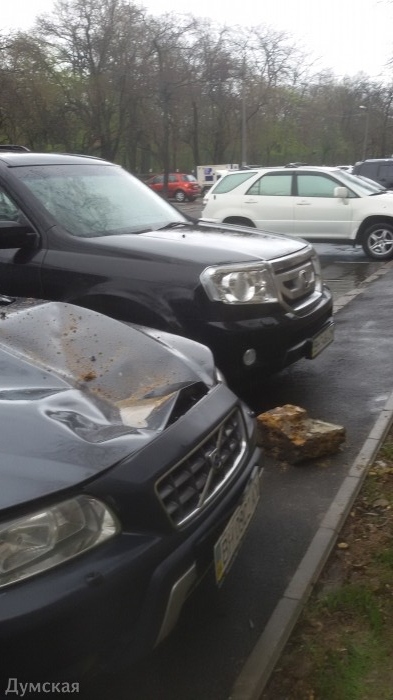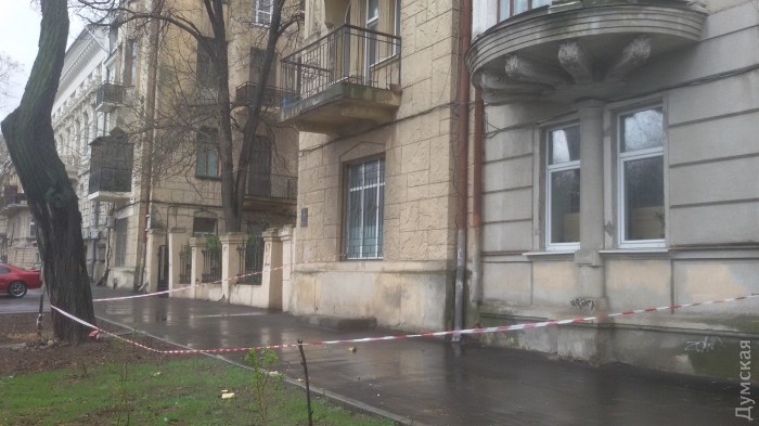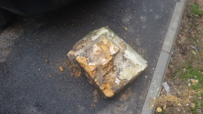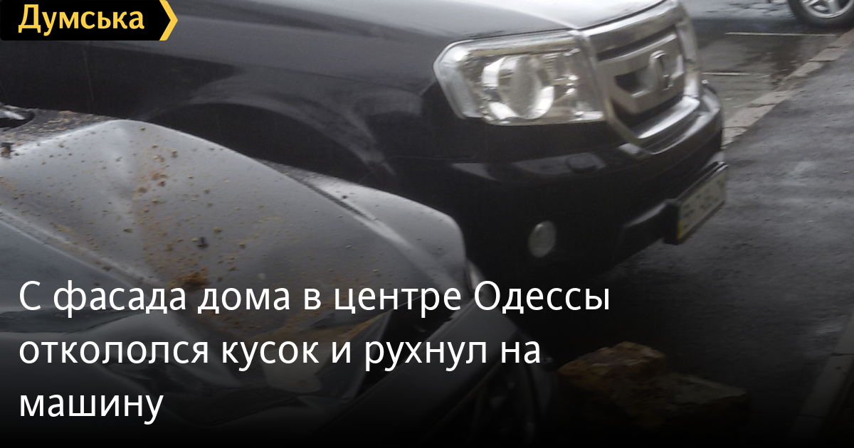 Как передает корреспондент «Думской», от фасада жилого дома на Маразлиевской, 12 откололся кусок и рухнул на капот припаркованного вдоль дороги автомобиля «Вольво».