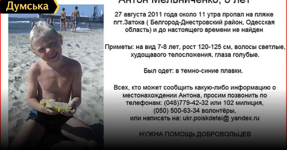 За три месяца 2013 года в Одесской области велись поиски девяти пропавших детей. Семеро из них - подростки в возрасте от 12 до 17 лет - найдены. Все они, к счастью, живы. Об этом сообщила волонтерская организация «Поиск пропавших детей». До сих пор не установлено местонахождение двоих пропавших мальчиков – Антона Мельниченко и Никиты Старикова. 8-летний Антон пропал в августе 2011 года на пляже в поселке Затока Белгород-Днестровского района. 1,5-годовалый Никита пропал 25 марта 2013 года со двора родительского дома в селе Доброалександровка Овидиопольскогой района. Волонтеры и милиция продолжают поиски ребенка. Одна из основных версий – похищение. СМЕРТЬ РОСІЙСЬКИМ ОКУПАНТАМ! Помітили помилку? Виділяйте слова з помилкою та натискайте control-enter Новини по цій темі: 4 квітня 2013: В Одесской области десятый день ищут пропавшего малыша 1 квітня 2013: Одесская область: пропавшего малыша до сих пор не нашли 28 березня 2013: Пропавшего малыша в Одесской области все еще не нашли 28 березня 2013: В Одесской области продолжаются поиски пропавшего малыша 27 березня 2013: К поискам пропавшего ребенка подключили водолазов, а милиция ищет данные с видеорегистраторов 27 березня 2013: Поиски пропавшего малыша в Одесской области: все по-прежнему |