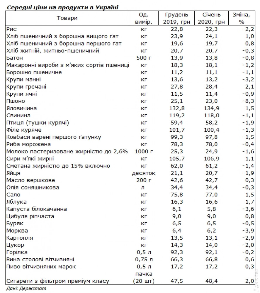 Государственная служба статистики Украины обнародовала данные об изменении потребительских цен с начала 2020 года. Согласно данным ведомства, большинство потребительских товаров в январе немного подешевели, а те, что подорожали – незначительно. Например, килограмм гречки стал дороже на 2,1% и сейчас стоит 28,4 грн. Говядина прибавила в цене на 1,5% — ее стоимость составляет 134,9 грн, а мягкие сыры – 1,1% и стоят 106,9 грн.
