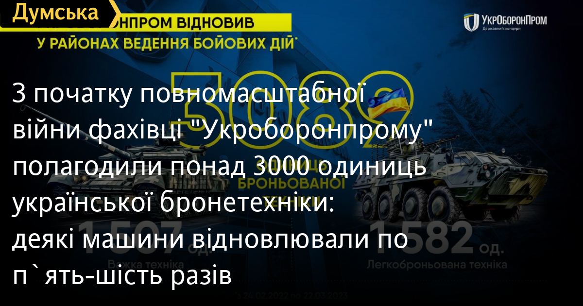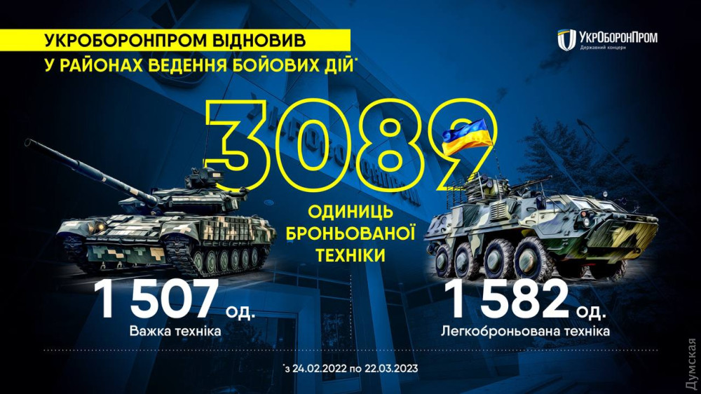 Ремонтні бригади держконцерну «Укроборонпрому» з 24 лютого 2022 року відремонтували й увели в дію 3089 одиниць української бронетехніки — 1582 легкоброньованих машин і 1507 танків і машин на їхній базі.