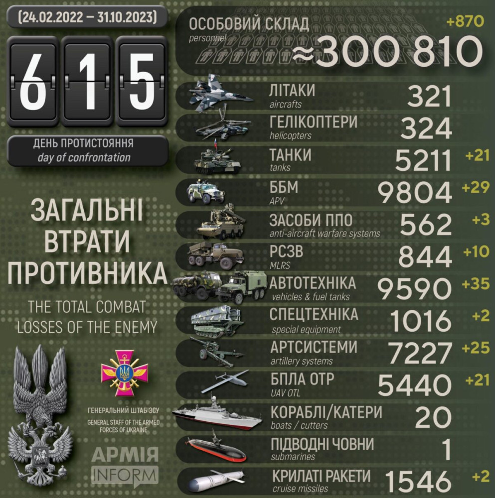 Крім того, за даними Генерального штабу Збройних сил України, наші захисники також знищили 29 бойових броньованих машин, 25 артсистем, десять РСЗВ, три засоби ППО, 21 БПЛА оперативно-тактичного рівня, 35 одиниць автомобільної техніки і дві одиниці спецтехніки.