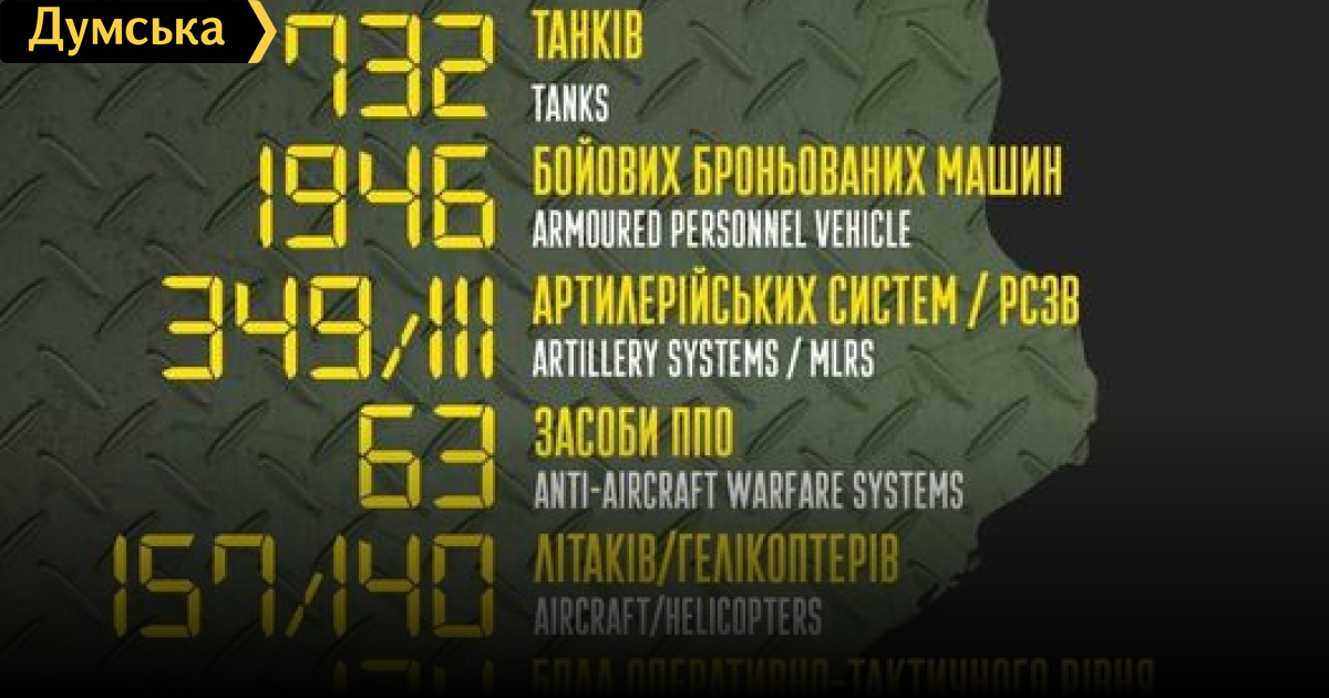 Российские оккупанты потеряли тысячи единиц техники и свыше 19,5 тысяч человек с начала военного вторжения в УкраинуС начала военного вторжения в Украину российские оккупанты потеряли уже около 19 600 человек личного состава. Об этом сообщили в Генштабе. Там отметили, что общие боевые потери противника на сегодняшний день ориентировочно составили: танков ‒ 732 единицы; боевых бронированных машин — 1946 единиц; артиллерийских систем – 349 единиц; РСЗО — 111 единиц; средства ПВО - 63 единицы; самолетов – 157 единиц; вертолетов – 140 единиц; автомобильной техники — 1406 единиц; корабли/катера — 7 единиц; цистерн с ГСМ - 76; БПЛА оперативно-тактического уровня – 124; специальная техника – 25; пусковые установки ОТРК/ТРК — 4. СМЕРТЬ РОСІЙСЬКИМ ОКУПАНТАМ! Помітили помилку? Виділяйте слова з помилкою та натискайте control-enter |