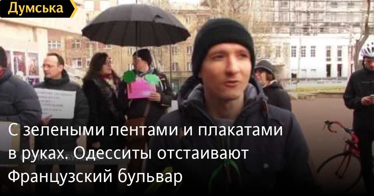 С зелеными лентами и плакатами в руках. Одесситы отстаивают Французский бульварС зелеными ленточками и плакатами в руках. В Одессе под стенами Театра музыкальной комедии прошел пикет под лозунгом «Сохраним Французский бульвар». Митингующие уверены: строительство высоток в исторической зоне и предполагаемое расширение дорожного полотна неминуемо приведет к вырубке сотен деревьев СМЕРТЬ РОССИЙСКИМ ОККУПАНТАМ! Заметили ошибку? Выделяйте слова с ошибкой и нажимайте control-enter Думская ТВ. Сюжеты: