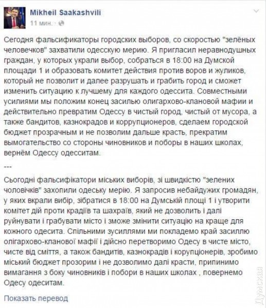 «Сегодня фальсификаторы городских выборов, со скоростью «зеленых человечков» захватили одесскую мерию. Я приглашаю неравнодушных граждан, у которых украли выбор, собраться в 18:00 на Троицкой 43 и образовать комитет действия против воров и жуликов, который не позволит и далее разрушать и грабить город и сможет изменить ситуацию к лучшему для каждого одессита. Совместными усилиями мы положим конец засилью олигархово-клановой мафии и действительно превратим Одессу в чистый город, чистый от мусора, а также бандитов, казнокрадов и коррупционеров, сделаем городской бюджет прозрачным и не позволим дальше красть, прекратим вымогательство со стороны чиновников и поборы в наших школах, вернём Одессу одесситам», — написал он на своей странице в «Фейсбуке».