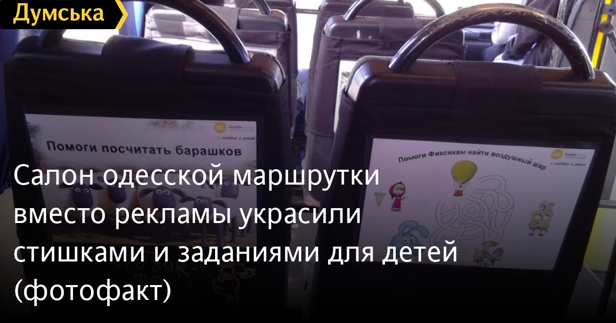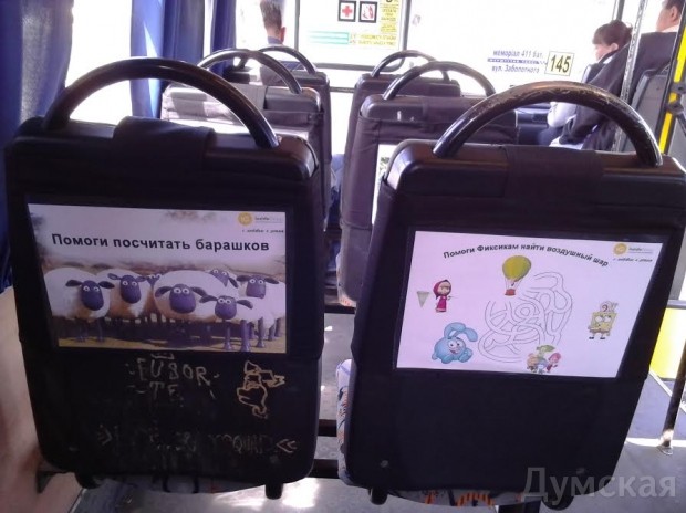 Спинки кресел в одном из одесских автобусов, обслуживающих маршрут №168 (в народе его называют «экскурсионным» — за продолжительность), украсили не рекламой, как обычно, а стишками и заданиями для детей.