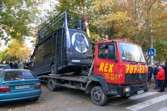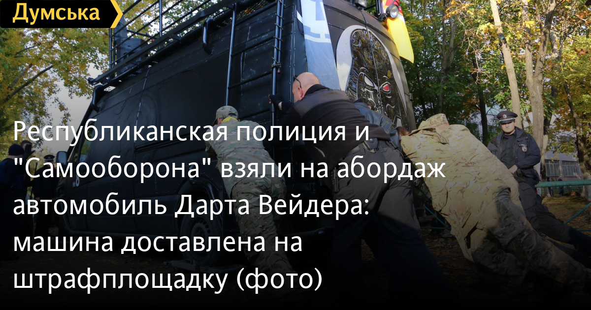 После изгнания с участка на Глушко Дарта Вейдера и задержания Чубакки силовики погрузили бесхозный «вейдеромобиль» на эвакуатор.