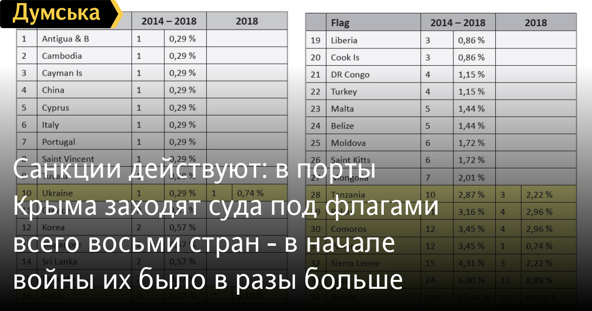 По данным мониторинговой группы «Майдану закордонних справ», «Інституту чорноморських стратегічних досліджень» и издания BlackSeaNews, если в 2014-2016 годах в крымские гавани заходили суда под флагами 33 стран, то в 2017-м таких флагов было уже 15, а в прошлом году их количество сократилось до 8.