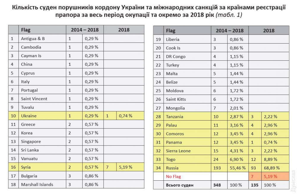 В 2018-м большинство судов-нарушителей было под флагом страны-агрессора — 93, или 68,89%. На втором месте — суда под флагом Того (12, или 8,89%), на третьем — Сирии (7, или 5,19%). По четыре судна зашло под флагами Палау и Коморских Островов, по три - с флагами Танзании и Сьерра-Леоне, по одному — Панамы и Украины. Всего санкционный режим в прошлом году нарушило 135 судов.