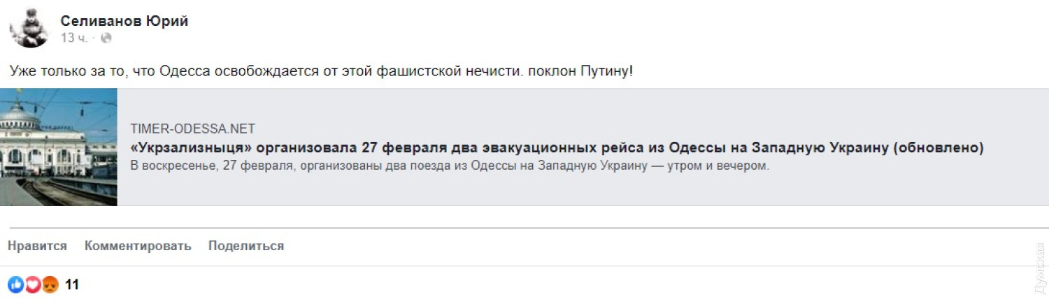 Сбежавший в Россию одесский «журналист» назвал эвакуирующихся из города женщин и детей «фашистской нечистью»Пророссийский «журналист» Юрий Селиванов, который до февраля 2014 года возглавлял одесский телеканал «Академия», а потом сбежал в Россию, публично назвал женщин и детей, которых эвакуируют из города на запад страны, «фашистской нечистью». Такое заявление он сделал на своей странице в Фейсбуке. Обязательно зайдите к нему и проявите фантазию. Юра, у нас очень хорошая память. А вообще, конечно, расчеловечивание со стороны российских нацистов вышло на принципиально новый уровень. Теперь «нечисть» для них все украинцы, вне зависимости от политических взглядов, пола, возраста и так далее. Они просто хотят нас убить. Что ж, вы знаете, что лучший способ избежать собственной смерти — убить тех, кто желает вашей. СМЕРТЬ РОСІЙСЬКИМ ОКУПАНТАМ! Помітили помилку? Виділяйте слова з помилкою та натискайте control-enter Новини по цій темі: 28 березня 2022: В Одесской области сократили комендантский час: находиться на улице можно будет на час дольше 26 березня 2022: Анализ текущей ситуации на фронтах и осторожные оптимистичные прогнозы: очередной подкаст "Думской" 25 березня 2022: Тридцатый день войны: унижение российского флота, контрудары на севере и продолжающийся ужас Мариуполя (обновляется) |