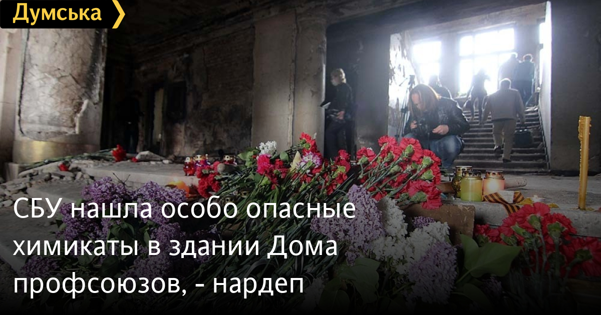 После трагических событий в Доме профсоюзов на Куликовом поле сотрудники Службы безопасности Украины обнаружили в здании емкости с особо опасным химическим веществом. Об этом со ссылкой на главу СБУ Валентина Наливайченко сообщил нардеп Владимир Куренной.
