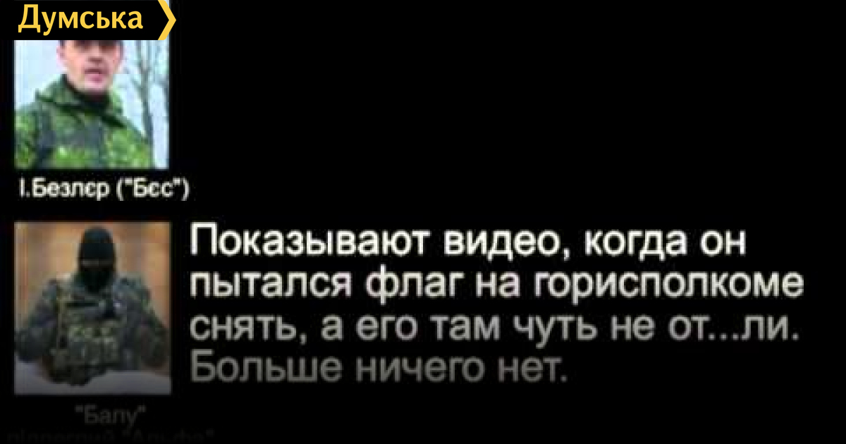 Установлено, что 17 апреля 2014 Безлер поручил начальнику самопровозглашенной милиции Горловки «нейтрализовать» Рыбака , который пытался вернуть флаг Украины на здание Горловского горсовета.