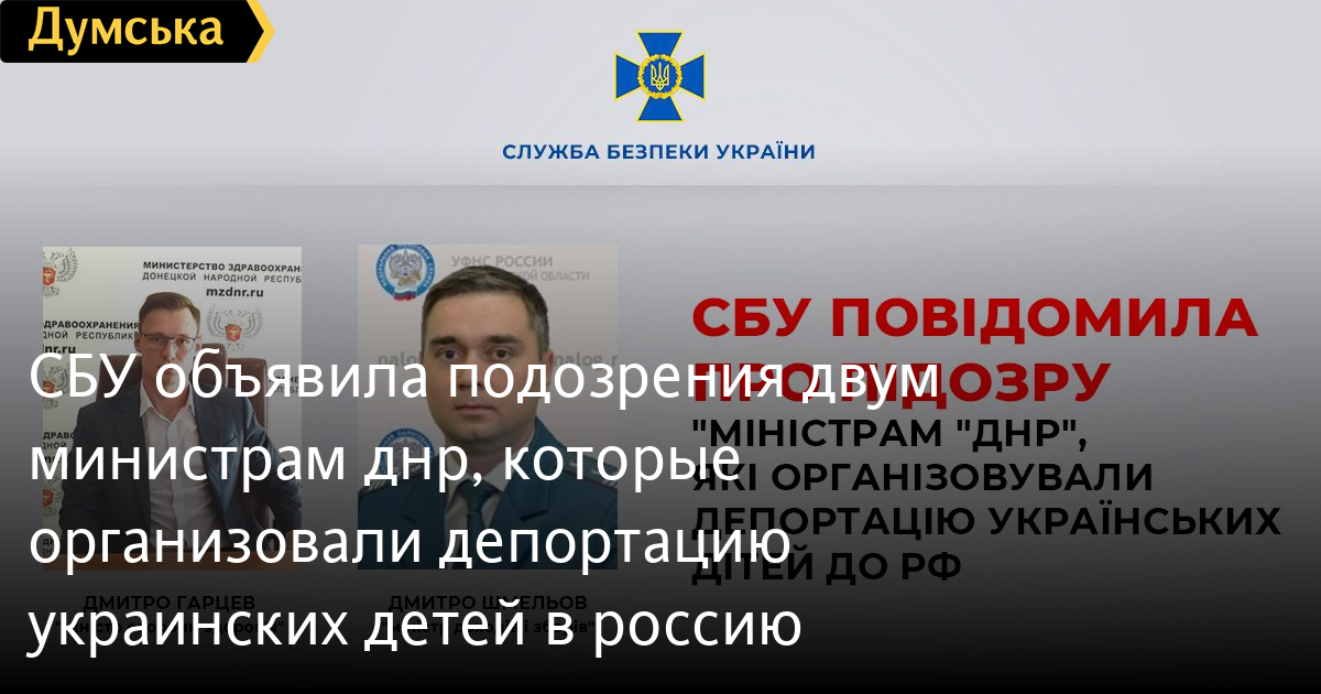 СБУ оголосила підозри двом «міністрам днр», які організували депортацію українських дітей до росіїСлужба безпеки України завершила розслідування щодо двох так званих «міністрів днр» — Дмитра Гарцева, який очолює «міністерство охорони здоров'я», і Дмитра Шмельова, голови «міністерства доходів і зборів». У СБУ повідомили, що інкримінують їм вчинення злочинів, передбачених ч.2 ст.110 Кримінального кодексу України — «посягання на територіальну цілісність і недоторканність України». Встановлено, що обидва підозрюваних брали участь в організації насильницького вивезення українських дітей на територію РФ під виглядом поїздок у літні табори відпочинку. Крім того, Гарцев займався перепрофілюванням лікарень у «днр» на госпіталі для поранених окупантів. Обидва фігуранти — громадяни росії, які входять до найближчого кола друзів «голови республіки» Дениса Пушиліна, завдяки чому в липні отримали «посади». СМЕРТЬ РОСІЙСЬКИМ ОКУПАНТАМ! Помітили помилку? Виділяйте слова з помилкою та натискайте control-enter |
