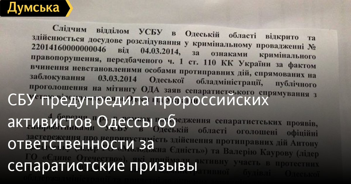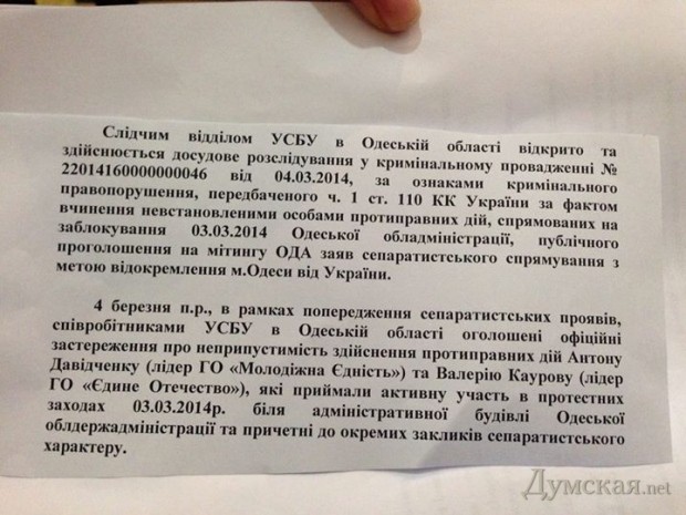 «Четвертого марта в рамках предупреждения сепаратистских проявлений сотрудниками УСБУ в Одесской области объявлено официальное предостережение о недопустимости противоправных действий Антону Давидченко (лидеру общественной организации «Молодежное единство) и Валерию Каурову (лидеру общественной организации «Единое Отечество»), которые принимали активное участие в протестных мероприятиях 3 марта возле административного здания Одесской обладминистрации и причастны к отдельным призывам сепаратистского характера», — говорится в сообщении УСБУ.