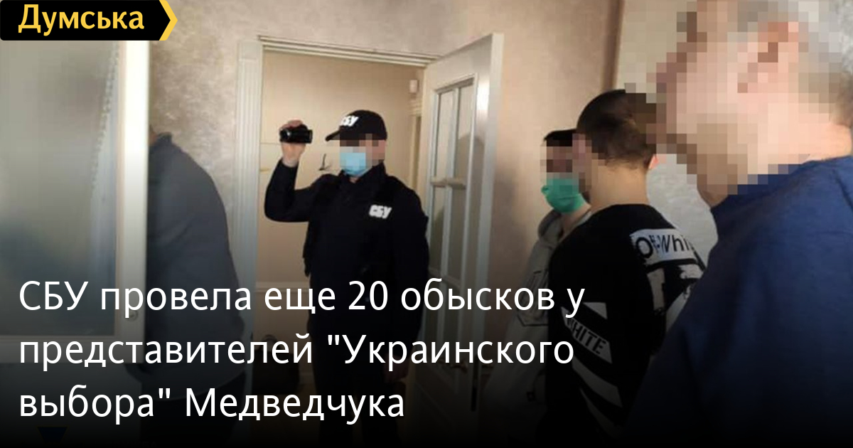 Служба безопасности Украины провела сегодня 20 обысков у руководства и представителей общественной организации «Украинский выбор», лидером которой является нардеп от ОПЗЖ и кум президента РФ Виктор Медведчук.