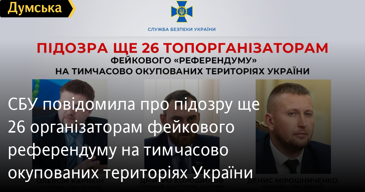 Як повідомляє пресцентр СБУ, слідчі зібрали доказову базу на ще 26 організаторів фейкового референдуму в Донецькій і Луганській областях України, серед яких — троє «посадових осіб» окупаційної адміністрації Луганської області. Це «голова» так званої «громадської палати лнр» Олексій Карякін, «голова» і «перший заступник голови» так званої «народної ради лнр» Денис Мірошниченко та Дмитро Хорошилов.