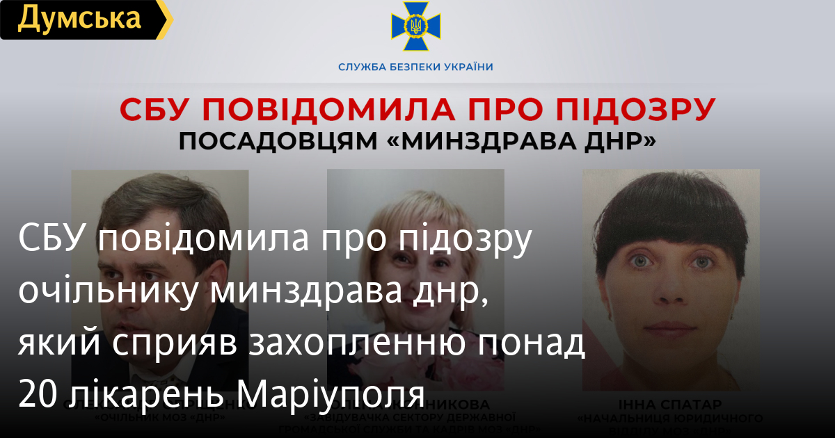 СБУ повідомила про підозру очільнику «минздрава днр», який сприяв захопленню понад 20 лікарень МаріуполяНеспростовні докази нових злочинів, вчинених керівництвом окупаційної адміністрації у захоплених районах Донеччини, зібрали українські спецслужби. Кіберфахівці викрили незаконну діяльність так званого «министра здравоохранения» терористичної організації «днр», повідомляють в СБУ. Встановлено, що він входить до найближчого оточення ватажка терористів – Пушиліна, який безпосередньо сприяв його призначенню на «міністерську посаду». Серед основних завдань «чиновника» було поширення окупаційного режиму у медичній галузі на тимчасово окупованій території регіону. Після початку повномасштабного вторгнення фігурант також організував примусове переведення на баланс підконтрольного рф «минздраву» більше ніж 20 захоплених медзакладів у Маріуполі, Волновасі та Мангуші. За даними слідства, до незаконної діяльності «посадовець» залучив своїх підлеглих, а саме двох керівників «юридичного відділу» та завідувачку «сектору громадської служби і кадрів» псевдоміністерства. Наразі Служба безпеки ідентифікувала ворожих поплічників з фейкового відомства, задокументувала злочинні дії та встановила їх місця перебування. Слідчі СБУ вже повідомили їм про підозру за ч. 1 ст. 258-3 (участь у терористичній групі чи терористичній організації) Кримінального кодексу України. СМЕРТЬ РОСІЙСЬКИМ ОКУПАНТАМ! Помітили помилку? Виділяйте слова з помилкою та натискайте control-enter |