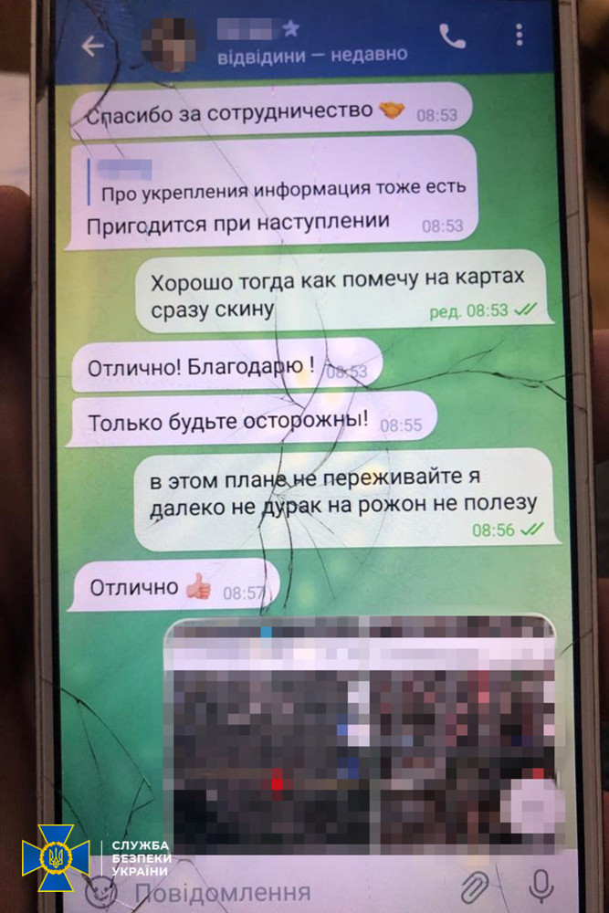 Со своим куратором предатель общался через специально созданный анонимный телеграм-канал. Данные о позициях Сил обороны он должен был передавать в виде фото и электронных карт с геолокацией.