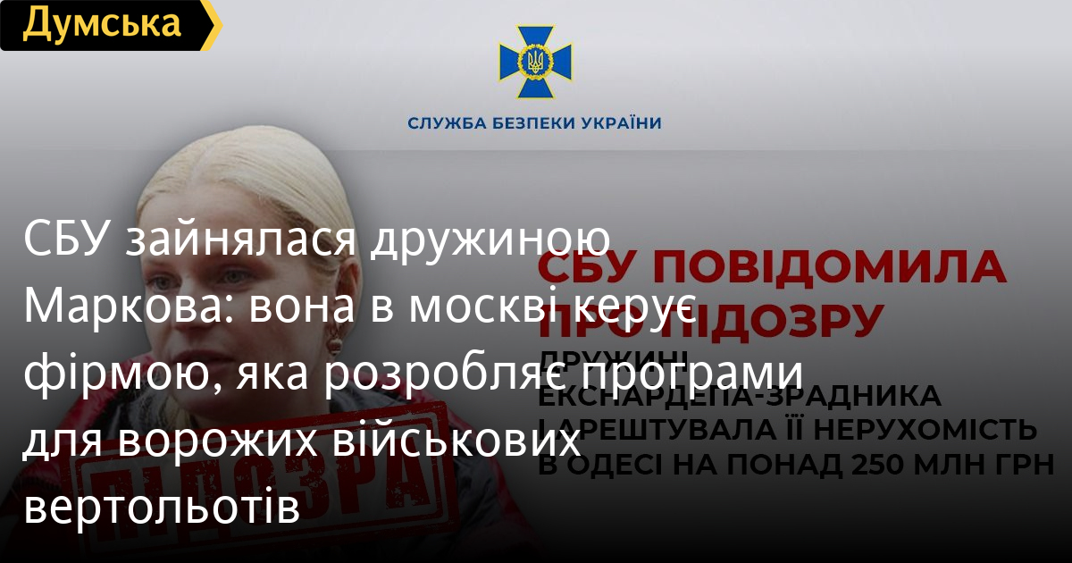 Служба безпеки України оголосила підозру у вчиненні державної зради Інесі Марковій — дружині одеського екснардепа-втікача, зрадника Ігоря Маркова.