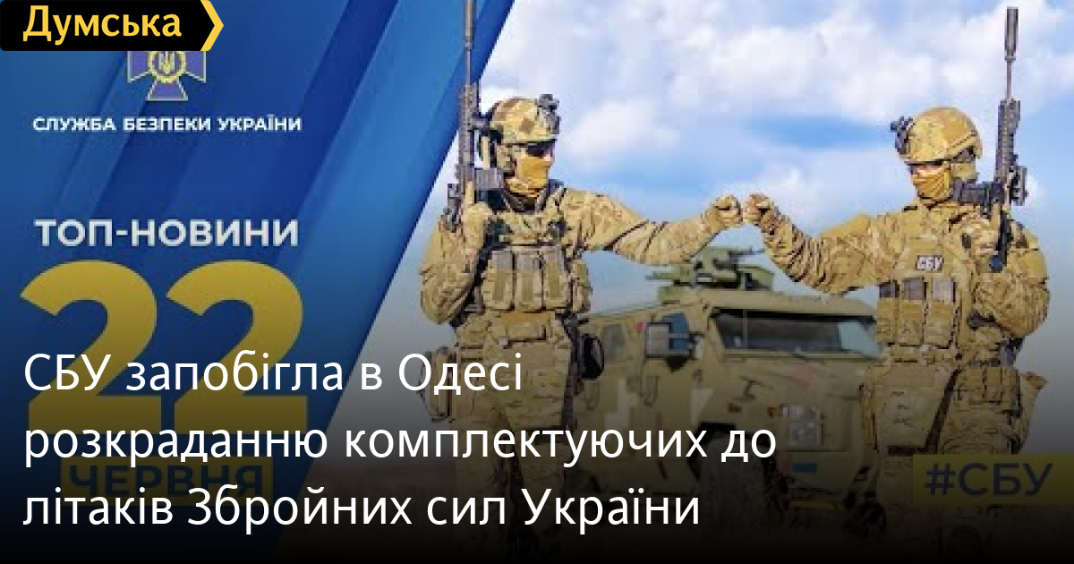 В Одесі на одному із підприємств Служба безпеки України запобігла незаконній реалізації комплектуючих до двигунів літаків Збройних сил України. Як повідомляє пресцентр Служби безпеки України, в Одесі на одному з держпідприємств зловмисники намагались незаконно реалізувати партію запчастин до авіадвигунів на загальну суму понад 10 млн грн. «Завдяки реагуванню контррозвідки СБУ у власність держави повернули більше півтисячі найменувань продукції», — йдеться у повідомленні.
