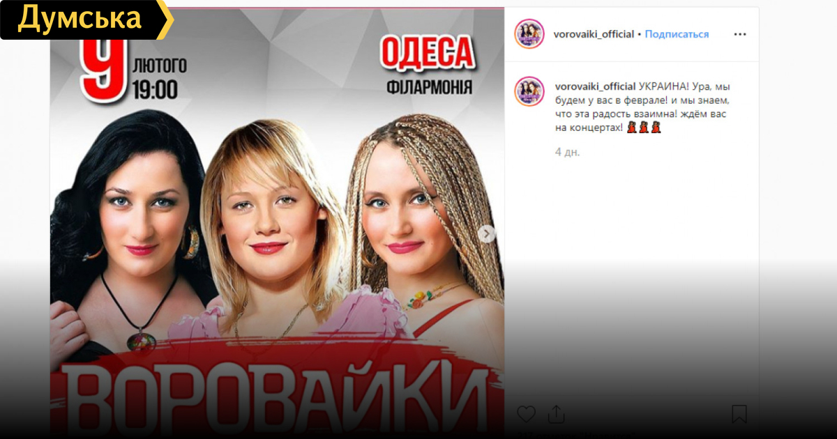 Служба безопасности Украины запретила въезд в нашу страну российской музыкальной группе «Воровайки», в репертуаре которой есть украинфобские песни. «Ныне действует запрет на въезд участницам этого коллектива Павловой Яне, Надыктовой Ларисе и Теркуловой Диане, — говорится в сообщении СБУ. — Решение принято с целью обеспечения национальной безопасности на основании Закона Украины «О правовом статусе иностранцев и лиц без гражданства». Напомним, 9 февраля «Воровайки» должны были выступать в Одесской филармонии. Кроме Одессы, «Воровайки» собирались дать концерты в Киеве, Харькове, Николаеве. СМЕРТЬ РОСІЙСЬКИМ ОКУПАНТАМ! Помітили помилку? Виділяйте слова з помилкою та натискайте control-enter |